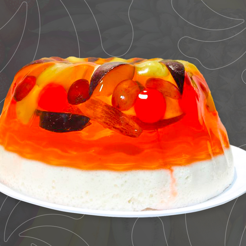 Gelatina de ciruela, durazno, fresa y uvas con crema